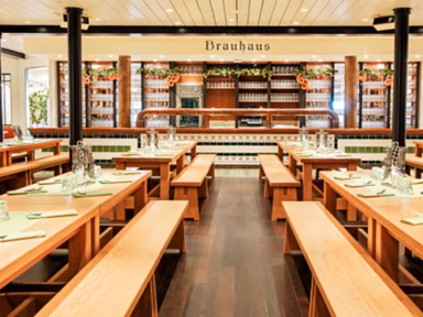 Three additional venues are free with the purchase of a drink: French Kiss (French cuisine), Tapas (Spanish small plates) and the Brauhaus, the ship’s most iconic social venue. The Brauhaus houses the onboard brewery, long bench seating, hearty German menus, and nightly entertainment. After dinner, it transforms into a loud, joyful gathering place with group singing and dancing, a kind of Oktoberfest at sea.